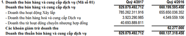 Tính riêng quý 4 doanh thu thuần đạt 830 tỷ đồng, tăng trưởng 25,8% so với quý 4/2016. Lợi nhuận gộp từ bán hàng và cung cấp dịch vụ trong quý đạt 54,6 tỷ đồng.