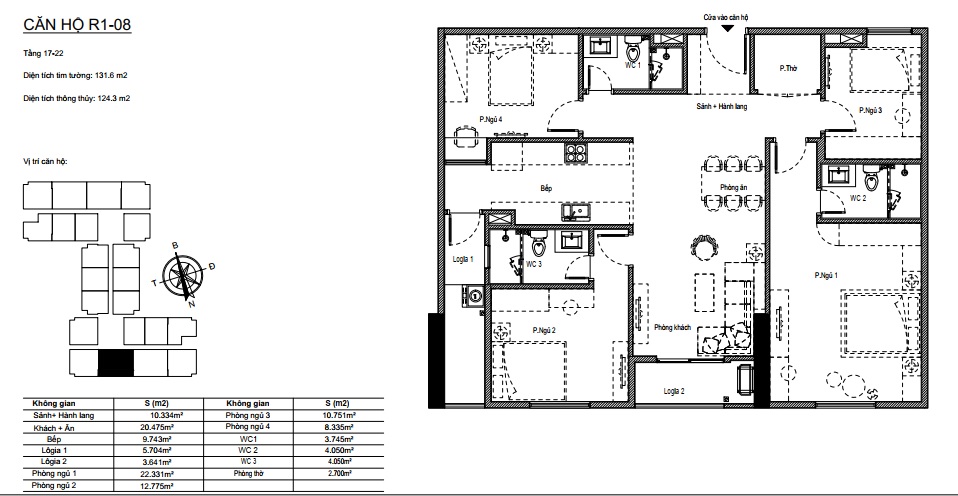 Căn hộ 124m2 trên mặt bằng từ tầng 17 đến tầng 24 có 4 căn hộ là căn R1-06, R1-08, R2-06 và R2-08.